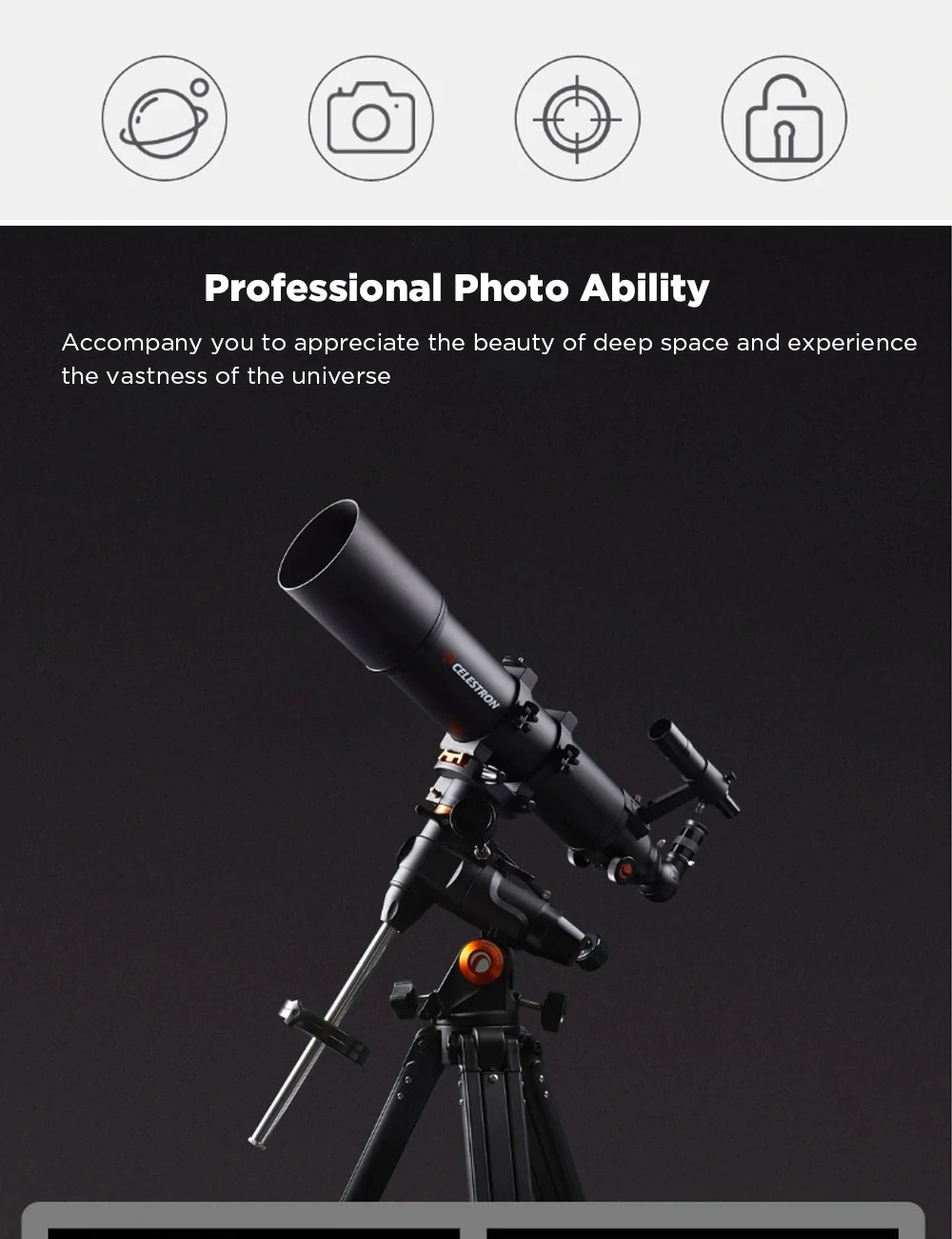 Teropong bintang dari CELESTRON SCTW-102EQ3 Hadir dengan kemampuan foto layaknya profesional sehingga ketika menemukan objek yang Anda ingin tangkap dan abadikan hasilnya akan lebih baik dan tampak nyata. hadir dengan built dan bahan berkualitas membuat jelajah luar angkasa jauh lebih menyenangkan.
