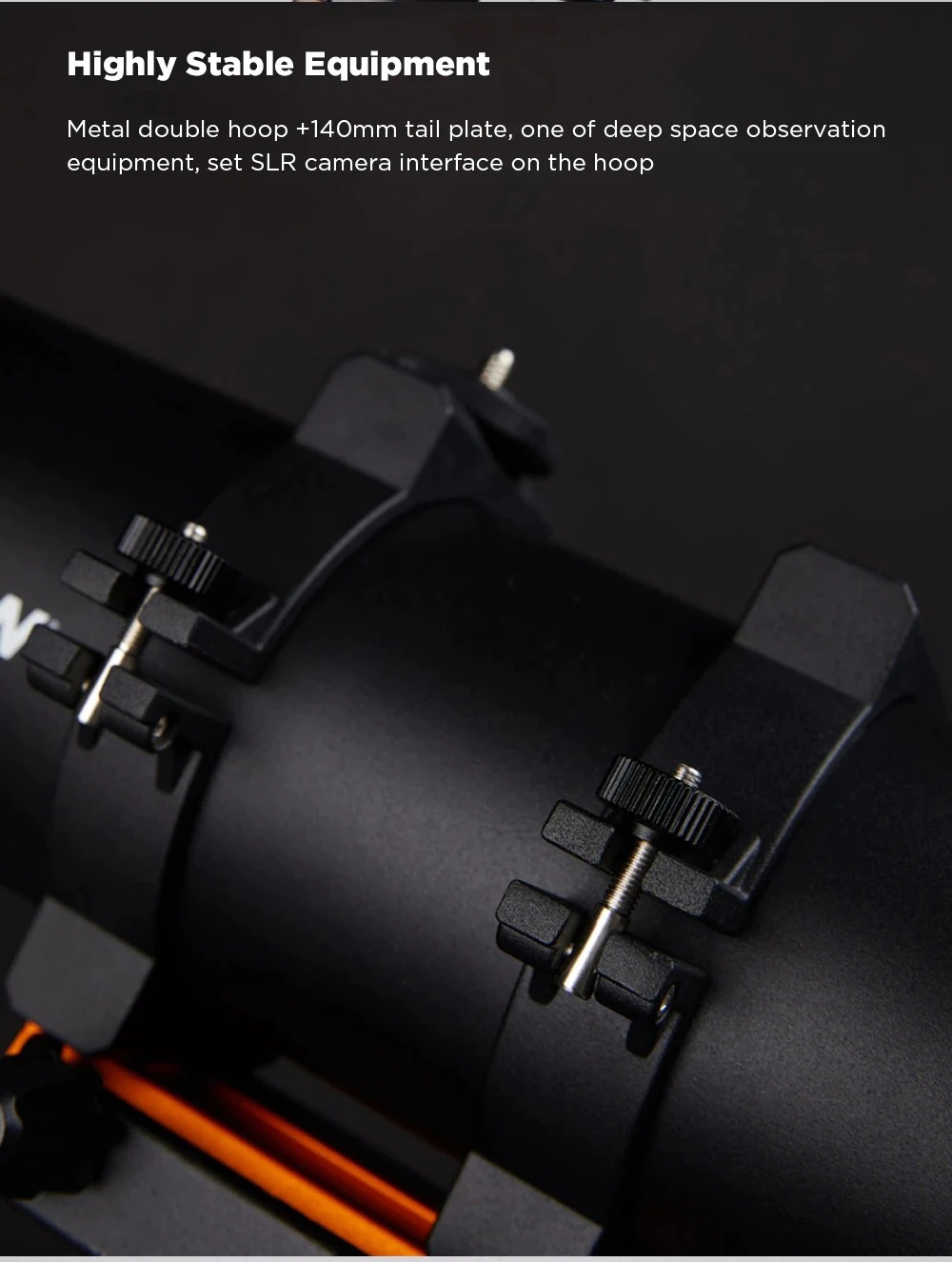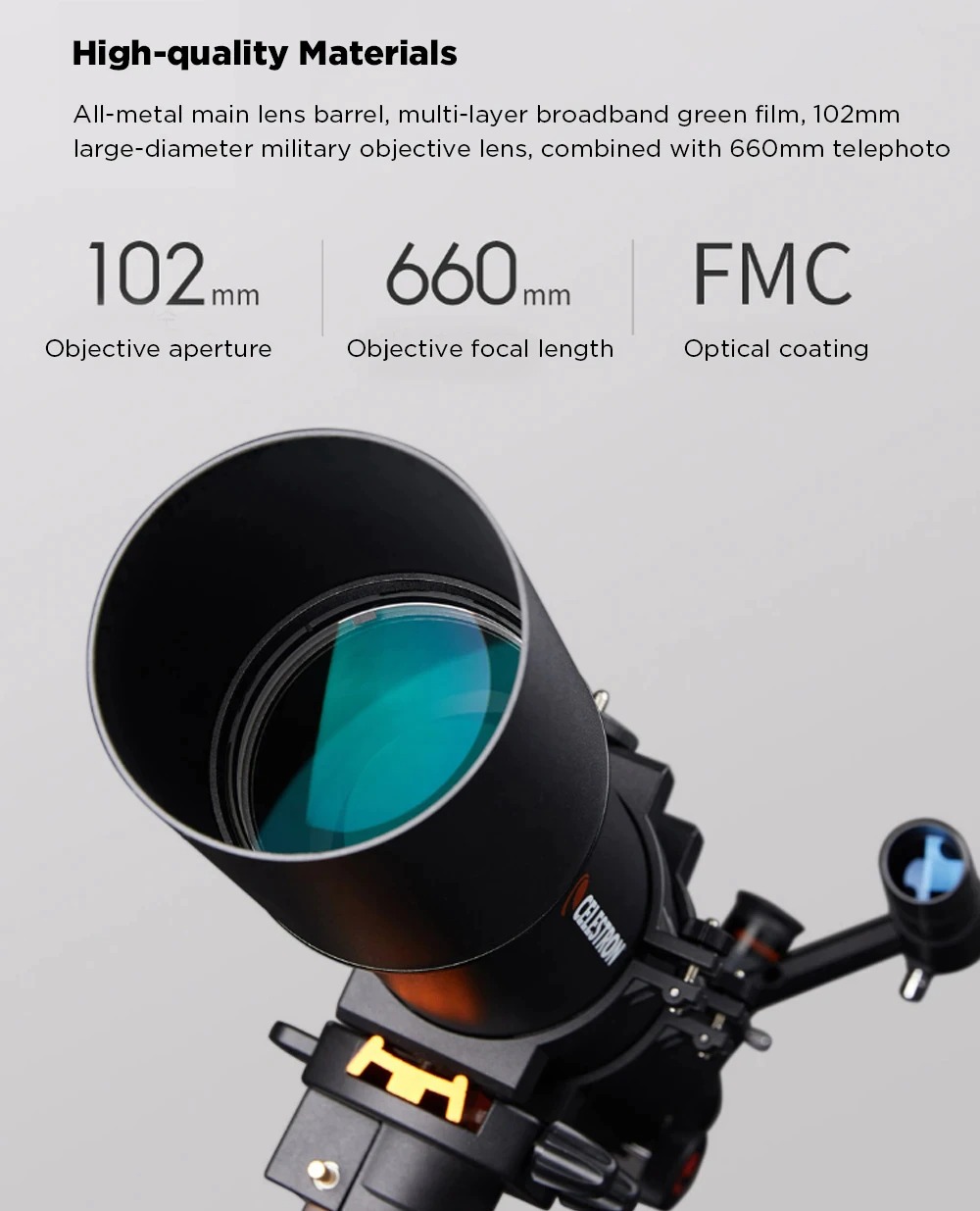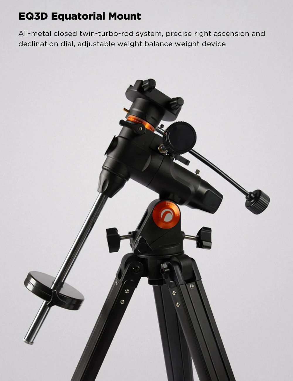 | Summary Spec | Material Optical coating: FMC multilayer green film Bracket type: Metal EQ3 equatorial mount Tripod: Double track aluminum alloy |