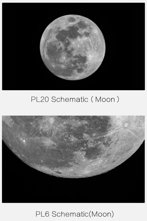 Anda akan mendapat 2 buah eyepieces dengan pembesaran PL6 (100x) dan PL20 (30x). Eyepiece yang digunakan akan menentukan seberapa detail objek yang dapat Anda lihat, sebagai contoh jika Anda mengamati permukaan bulan menggunakan eyepiece PL20 Anda dapat melihat bulan dalam keadaan utuh dengan lebih jelas, sedangkan PL6 Anda dapat melihat bulan dengan lebih dekat sehingga kawah-kawahnya dapat Anda lihat.