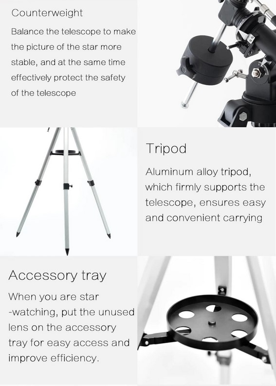 Banyak Aksesoris Pendukung Teropong bintang ini dilengkapi banyak aksesoris pendukung yang akan membuat proses observasi dengan teropong ini semakin mudah dan menyenangkan. Anda akan mendapat equatorial mount, star finder, mobile phone holder, counterweight, tripod, accessory tray, constellation, dan aksesoris pendukung lainnya. Tidak lupa untuk memudahkan Anda membawanya, teropong ini sudah dilengkapi dengan tas carrier.